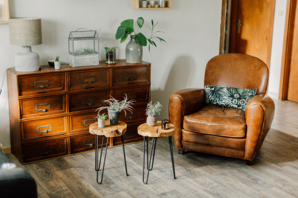 Meuble d'administration vintage / Table en bois & métal et Club Cuir Maisons du Monde / Coussin imprimé tropical réalisé sur-mesures / Vases et cadres en bois Depot / Lampe pied béton Leroy Merlin