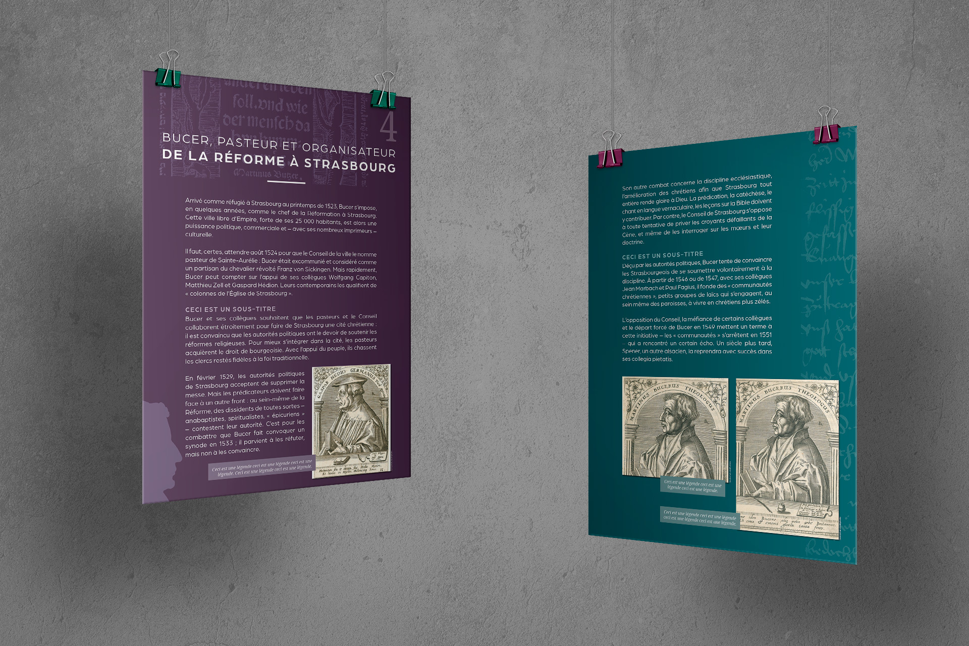 - Proposition d'un concept graphique pour les panneaux de l'exposition sur Bucer présentée à la Médiathèque Protestante du Stift et remise des fichiers natifs pour que les panneaux puissent être réalisés en interne par le service de communication de l'UEPAL.